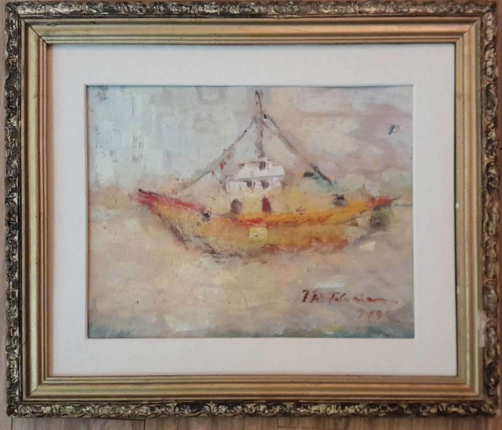 Marina cu vas portocaliu, tablou semnat Th. Florian (?), 39x46 cm