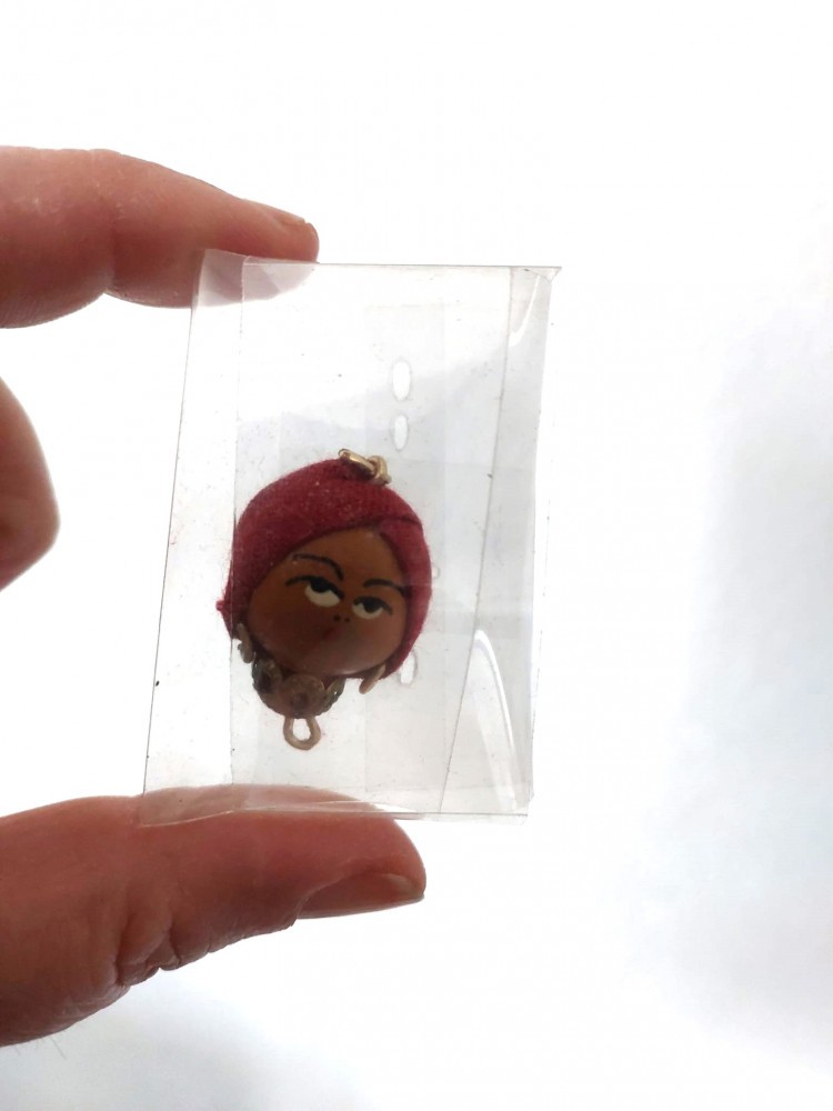 Martisor vechi romanesc anii 70-80, cap de femeie - lemn si material textil - in cutiuta de material plastic transparet -