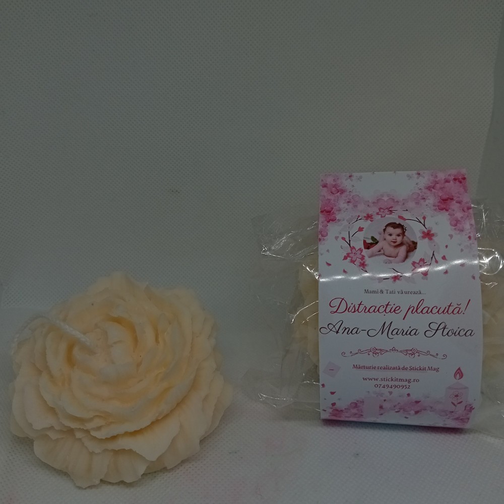 Marturie Botez Floare – model Pink Roses pentru fetite, realizata din ceara naturala de soia 100% parfumata. Un cadou delicat si memorabil pentru invitati.