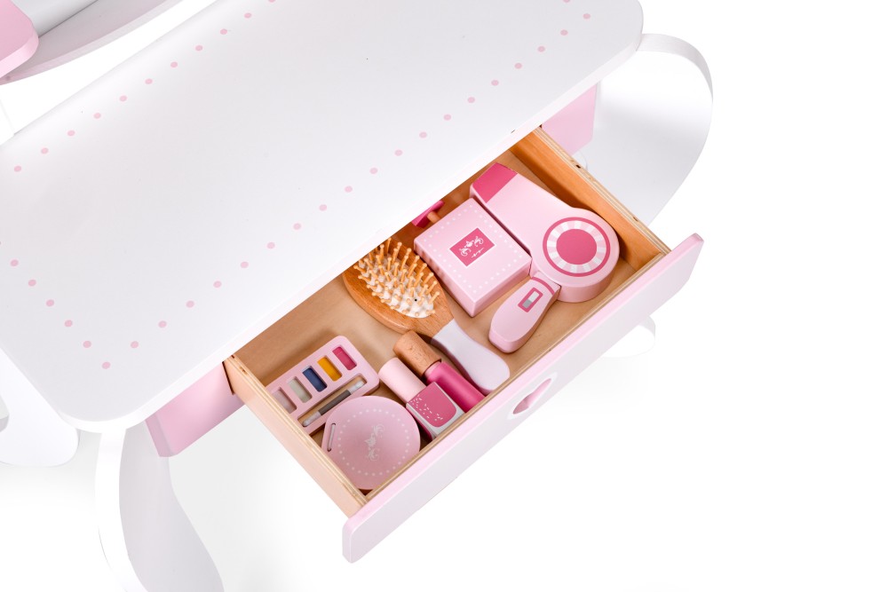 Măsuța de toaletă este concepută astfel încât fetițele să o poată imita pe mama lor în ritualurile zilnice de frumusețe. Dotată cu accesorii realiste și o oglindă mare decorativă, este visul devenit realitate al oricărui mic make-up artist. Datorită jucăriei, copiii își vor dezvolta dexteritatea și imaginația și vor avea ocazia să învețe elementele de bază ale machiajului.