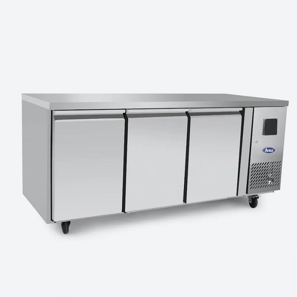 Masa frigorifica inox-3 usi Masa de frigorifica profesionala din inox cu 3 usi, fara rebord la perete Constructie interior-exterior inox Interior cu colturi rotunjite pentru curatare usoara, conform normelor H.A.C.C.P. Izolatie din poliuretan ecologic 60 mm 3 Grilaje cu invlis din plastic Ghidaje potrivite si pt tavi GN Dotata cu 4 roti, dintre care 2 cu sistem de blocare Mecanism de blocare integrat/incuietoare Capacitate: 420 litri Temperatura: -2* / + 8*C Alimentare: 220 V Putere: 400 W Dimensiuni masa: 1795*700*850 mm Racire ventilata Dezghetare automata (cu gaz cald/Hot Gas Defrost) Iluminare interioara pe baza de led Panou de control digital Freon ecologic R290 Greutate neta: 120 kg Masa frigorifica inox-3 usi