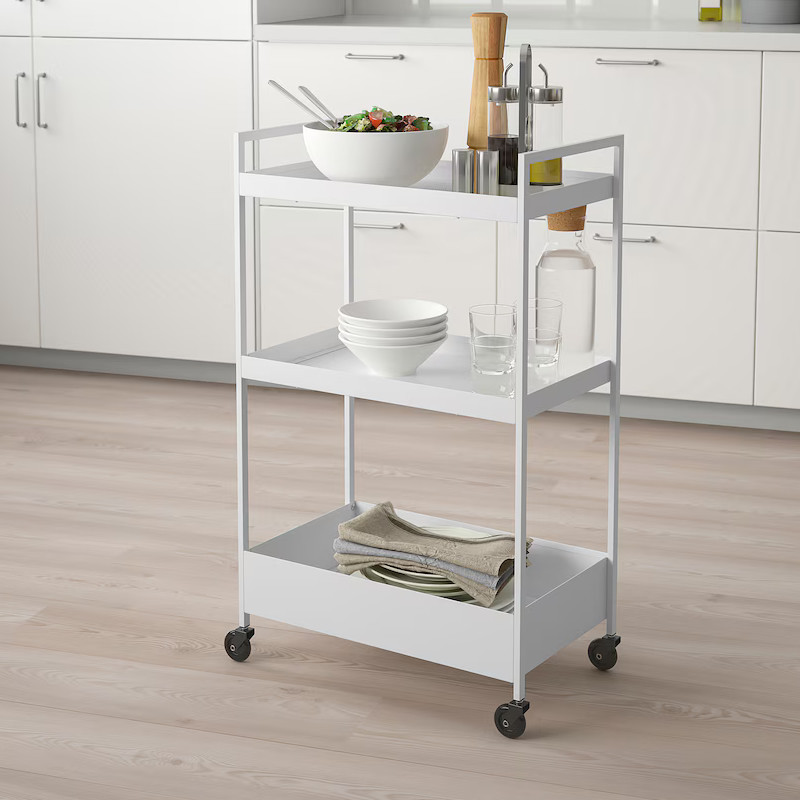 Acest carucior alb cu 3 rafturi combina stilul modern cu
