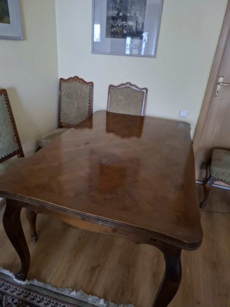 Masa vintage pt 6 persoane, extensibilă pt 12. 6 scaune vintage
