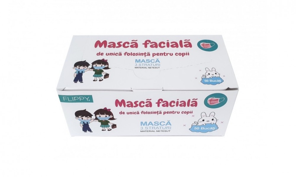 Set 50 bucati Masti faciale, igienice, Flippy®, de unica folosinta, nesterile, PFE, cu elastic, Roz, pentru copii Masca faciala simpla este un dispozitiv modelat, flexibil, care se pozitioneaza peste nas si gura, pentru a asigura o acoperire respiratorie de baza.