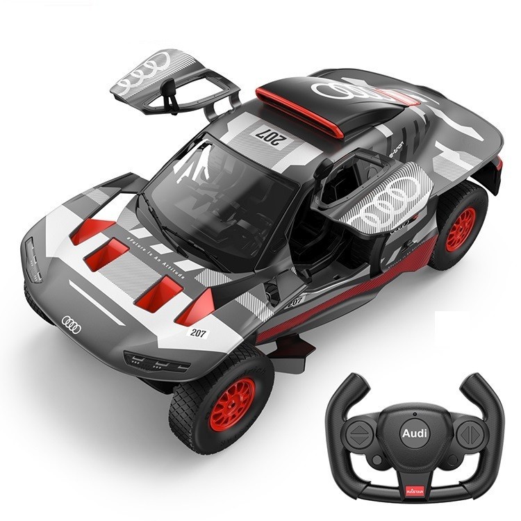 Copilul dumneavoastra se poate juca in voie cu masina cu telecomanda Audi RS Q E-TRON, scara 1 la 14, oferita de brandul international Rastar. Nicio cursa nu este imposibil de castigat cu acesta masinuta, replica oficiala cu licenta a modelului original, construita cu mare atentie la detalii. Masinuta are proportiile ideale pentru momente pline de distractie si amuzament, avand dimensiunile in centimetri dupa cum urmeaza 35*14.6*8.Masinuta functioneaza pe frecventa de 2.4G.Alimentarea se face astfel pentru masinuta sunt necesare 5 baterii tip AA , iar pentru telecomanda 2 tip AA.Masinuta se poate deplasa in toate directiile inainte, inapoi, stanga sau dreapta. Portierele masinutei se pot deschide. Masina cu telecomanda Audi RS Q E-TRON, scara 1 la 14, poate rula cu o viteza aproximativa de 10km/h, are tractiune 2WD, anvelope de cauciuc, posibilitate de reglaj a directiei direct pe sasiu si o raza de actiune a telecomenzii de circa 20 de metri.Acesta masinuta are si o functie suplimentara care face ca farurile si stopurile masinutei sa lumineze.