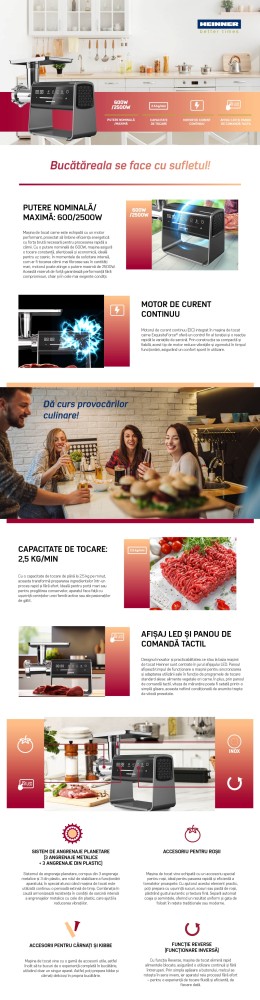 Masina de tocat HEINNER EXQUISITEFORCE, 2500 W, Control Touch, Angrenaj plantar 6 roti, Accesoriu rosii, kibbe si carnati