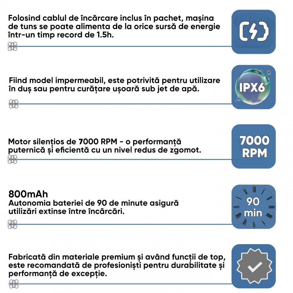 2. Cum se intretine masina de tuns?Este important sa cureti lamele dupa fiecare utilizare, sa le ungi periodic si sa le verifici pentru semne de uzura. De asemenea, asigura-te ca bateria este incarcata corespunzator.