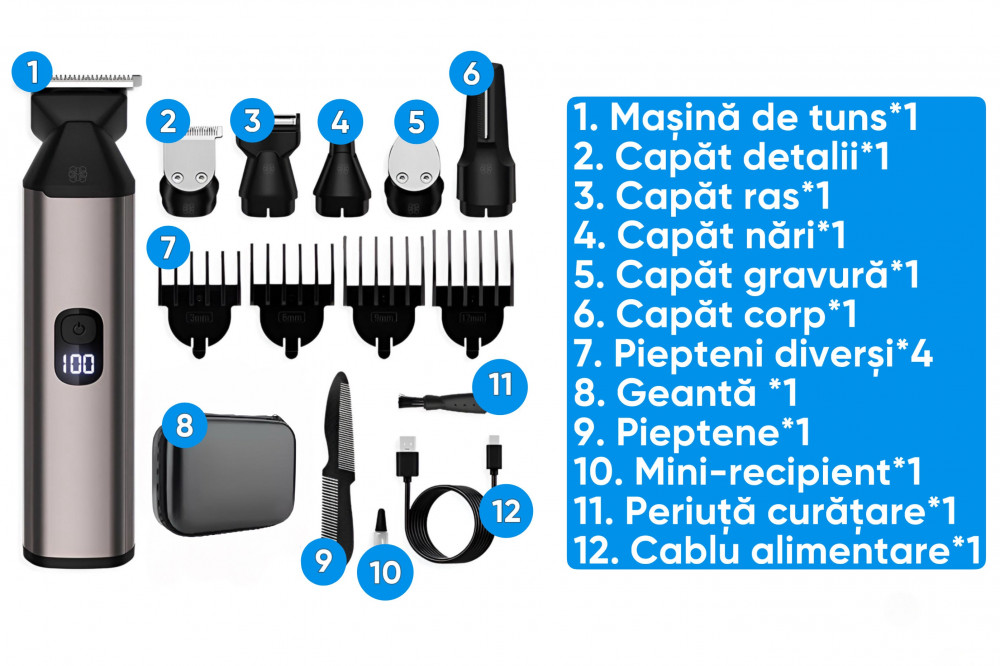 Aparatul vine cu o gama variata de piepteni, permitandu-ti sa experimentezi diferite stiluri si lungimi de taiere, adaptandu-se astfel nevoilor tale specifice.