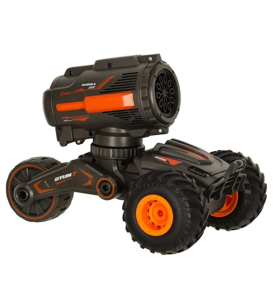 O modalitate inovatoare de a face bule de săpun – mașina cu telecomandă care eliberează bule! Vehiculul seamănă cu orice alt model cu telecomandă, cu o diferență – are o mașină de bule montată pe acoperiș, care este activată prin apăsarea unui buton de pe controler. Controlerul vă permite, de asemenea, să controlați liber vehiculul și să porniți muzica, luminile și să transformați mașina. Modelul circulă în patru direcții și are anvelope din cauciuc, permițându-i să circule pe diferite suprafețe. Mașina cu bule din mașină poate fi transformată într-un pistol cu bule. Atât mașina, cât și pistolul sunt alimentate cu baterii. Setul include un recipient pentru săpun lichid, două plicuri de săpun lichid, un cablu de încărcare și o șurubelniță.