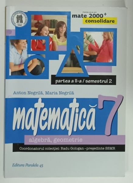 MATEMATICA , ALGEBRA SI GEOMETRIE , MANUAL PENTRU CLASA A - 7 -A , PARTEA A - II -A / SEMESTRUL 2 de ANTON NEGRILA si MARIA NEGRILA , 2014
