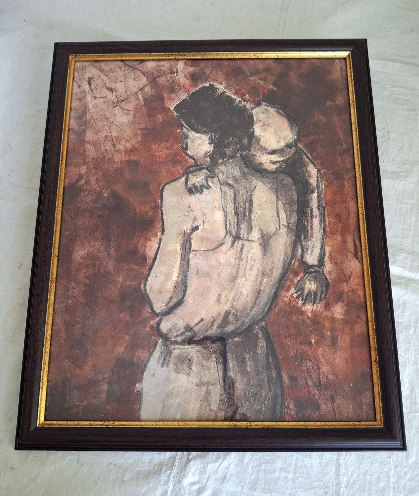 Lucrare cu tematica maternitatii, realizata in guasa, ceracolor si carbune pe hartie lipita pe carton. Nesemnata si nedatata, dar cu un puternic impact vizual, se remarca prin compozitia sugestiva si tehnica mixta bine dozata. Rama noua, cu dimensiuni exterioare de 48 x 39 cm. Stare buna.