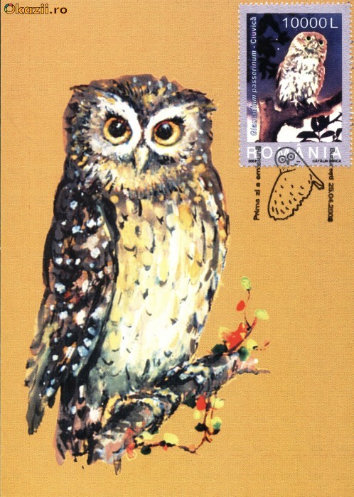 Maxima Cucuvele Ciuvica (Glaucidium passerinum).Stampilat cu prima zi a emisiunii la 25.04.2003.Stare buna.