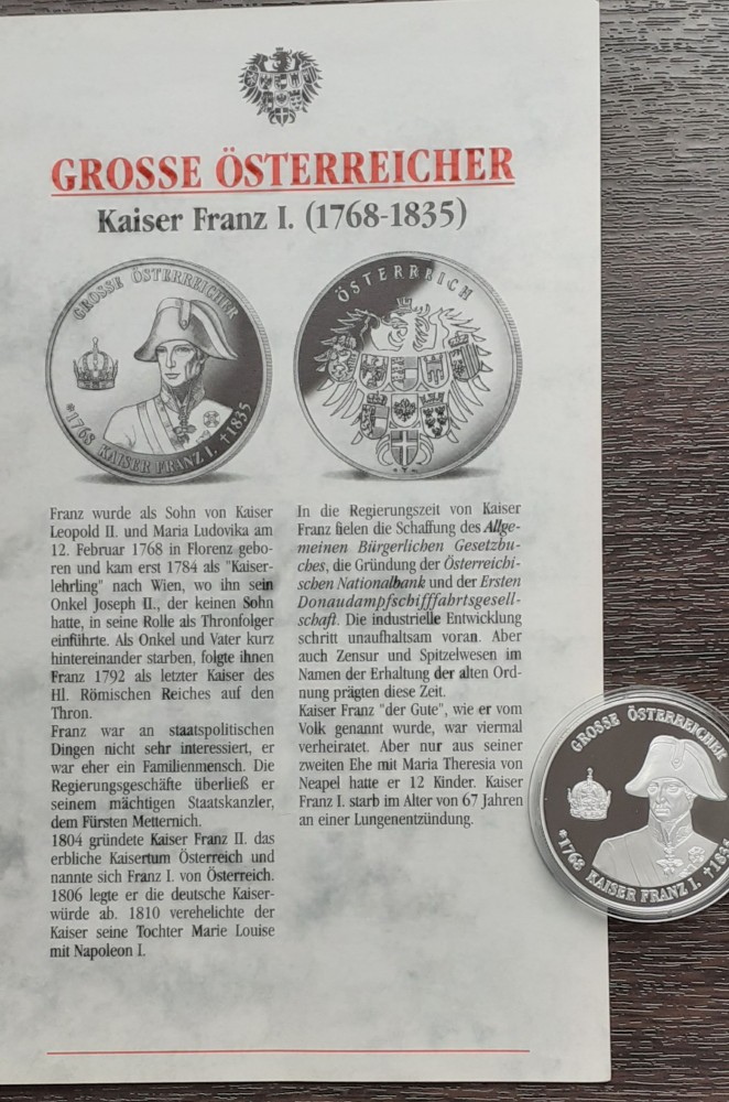 MEDALIE DIN ARGINT AUSTRIA - SERIA PERSONALITATI, CU CERTIFICAT, KAISER FRANZ I