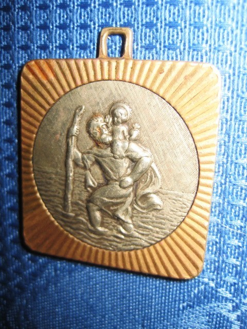 Medalion- Sfantul Cristofor1, alama argintata, cca 3.5 cm.