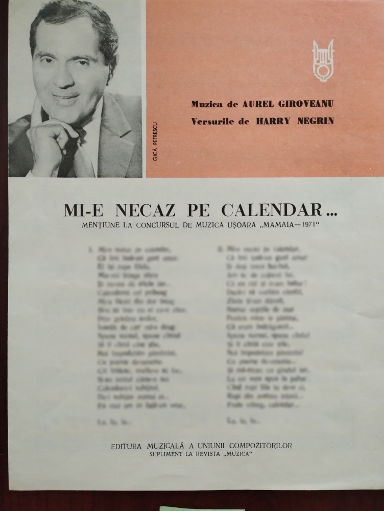 Mi-e necaz pe calendar - muzica: Aurel Giroveanu - versuri: Harry Negrin - voce: Gică Petrescu // Mențiune la Festivalul național de muzică ușoară Mamaia 1971 // Editura Muzicală a Uniunii Compozitorilor București - supliment la revista Muzica // 6 pagini 26x20 cm // Stare foarte bună, aproape impecabilă (exact ca în imagini) - completă, fără pagini lipsă, fără decupaje, fără mâzgălituri