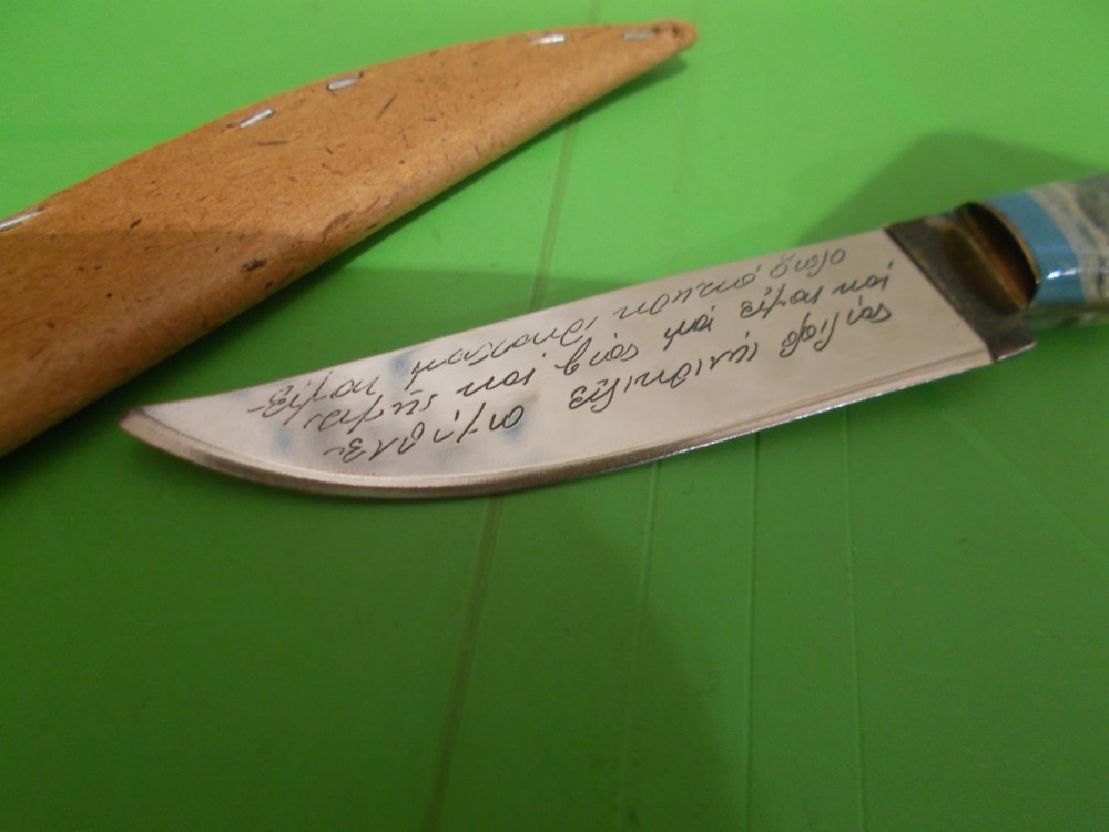 Micut CUTIT de colectie cu LAMA GRAVATA MANUAL cu o inscriptie , cutitas