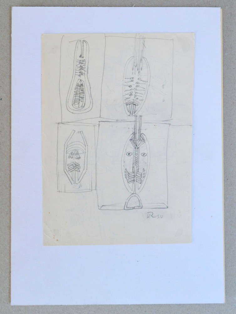 Mihai Rusu "Masti" desen in creion pe hartie fixata pe un suport de carton.