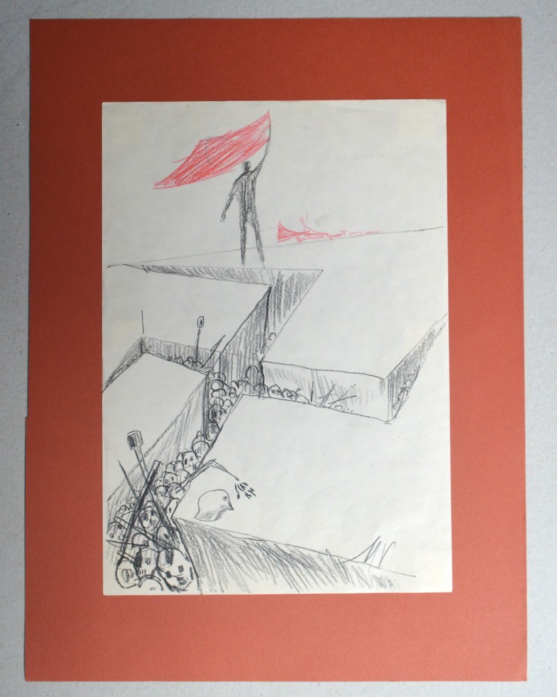 Mihu Vulcanescu "Victoria impotriva fascismului" desen pe hartie fixata pe un suport de carton subtire.
