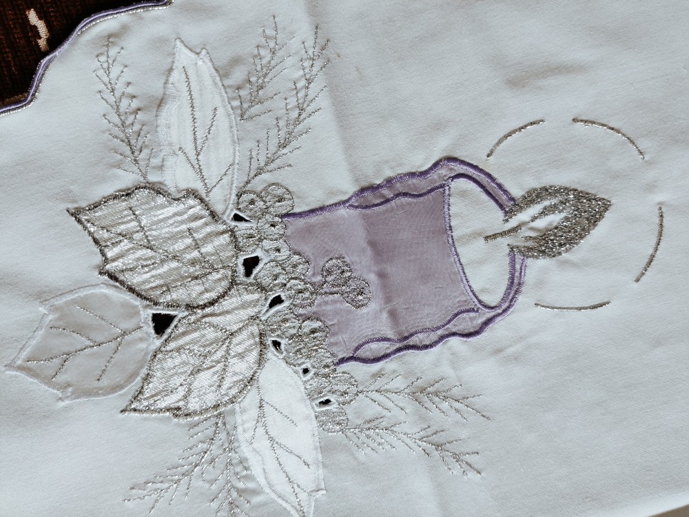 Mielul este din pânză fină albă, broderie model festiv, mov, argintiu.
