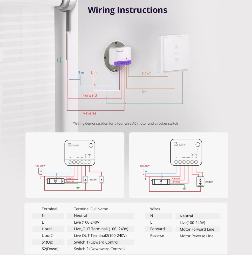 Datorita designului sau inteligent, Sonoff MINI-RBS se va potrivi in cutiile de instalare europene cu o adancime minima de 60 mm. Dimensiunile sale compacte permit o instalare discreta, fara a modifica infrastructura existenta. Integrarea perfecta cu cabluri cu 4 sau 5 fire (cu neutru, linie de deschidere si inchidere si masa) asigura o compatibilitate larga cu cele mai populare motoare de obloane.