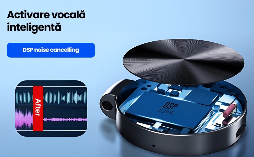 Tehnologia DSP proceseaza sunetul in timp real, identificand si eliminand zgomotele de fundal nedorite (rumoarea traficului, zumzetul aparatelor, vantul). Sistemul analizeaza spectrul sonor si diferentiaza intre vocile umane si zgomotul de ambient, prioritizand captarea clara a conversatiilor.