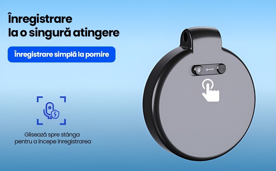 Glisarea butonului lateral porneste imediat inregistrarea, fara necesitatea parcurgerii meniurilor sau setarilor complexe. Designul intuitiv permite utilizarea imediata. Forma de breloc asigura portabilitatea si camuflajul in utilizarea zilnica. Dispozitivul se ataseaza usor la chei, geanta sau rucsac.