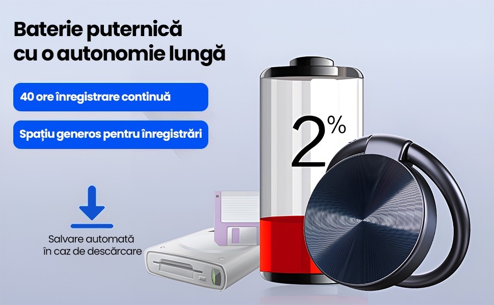 Acest reportofon cu activare vocala ofera pana la 40 de ore de inregistrare continua pe o singura incarcare completa. Sistemul de salvare automata protejeaza inregistrarile: cand bateria ajunge la un nivel critic, dispozitivul salveaza automat fisierul curent si se opreste controlat.