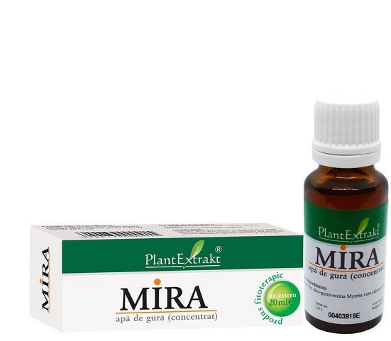 Mira - Apa de Gura Recomandari: Imbunatateste igiena cavitatii bucale, reduce starile inflamatorii la nivelul cavitatii bucale si a gatului. Flacon cu 20 de ml. Pentru igienizarea cavitatii bucale se dilueaza 15 - 20 picaturi la un pahar cu apa - pentru gargara. Pentru inflamatii ale cavitatii bucale 10 picaturi se dilueaza cu o lingurita de apa si se clateste energic 30 de secunde insistand pe zonele afectate. Pentru inflamatii ale gatului se dilueaza 25 - 30 de picaturi la un pahar cu apa pentru gargara. A se agita inainte de administrare! A nu se depasi doza zilnica recomandata! A nu se lasa la indemana copiilor! Suplimentele alimentare nu inlocuiesc un regim alimentar variat. Prin natura lor, produsele naturala pot prezenta usoare depuneri care nu afecteaza calitatea.
