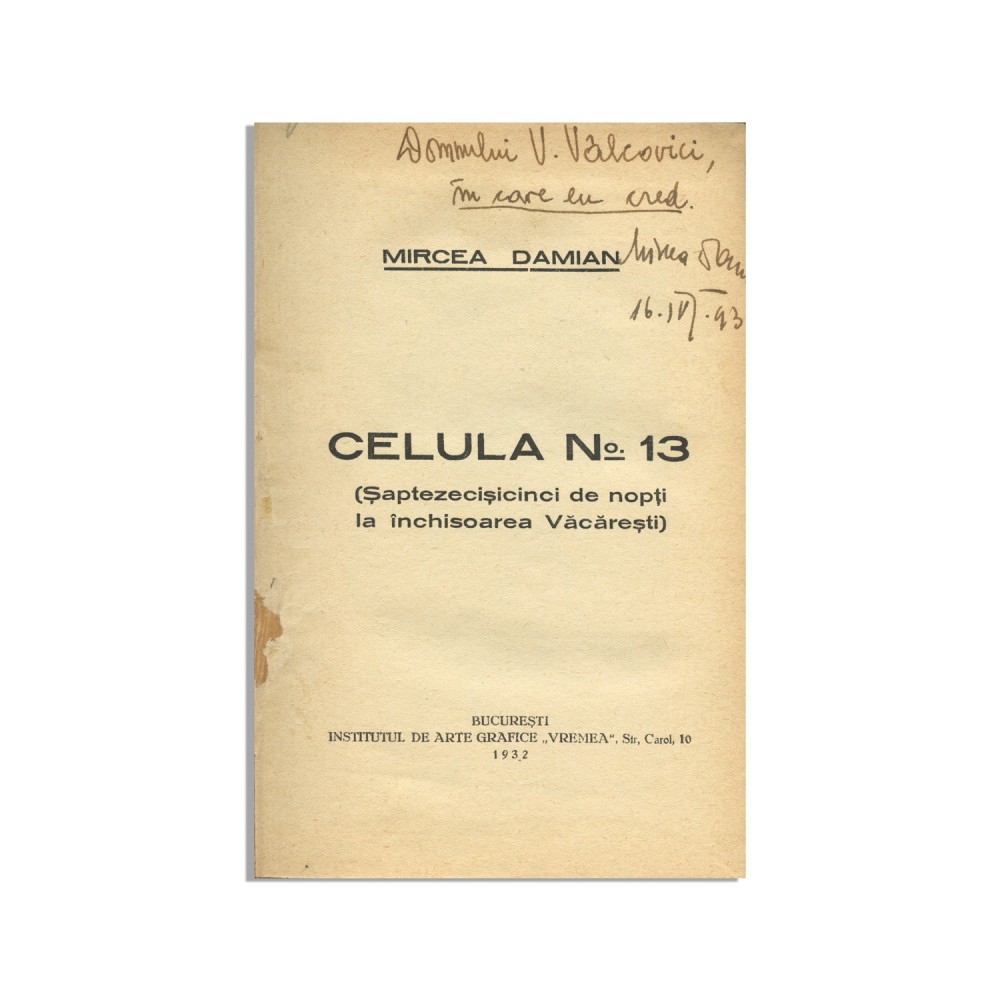 Mircea Damian, Celula Nr. 13 (Șaptezecișicinci de nopți la închisoarea Văcărești), București, Institutul de Arte Grafice „Vremea”, 1932, 179 p., cu un portret al autorului realizat de Ion Teodorescu-Sion. Volumul poartă pe pagina de titlu dedicația olografă a autorului oferită profesorului și matematicianului Victor Vâlcovici. Legătură contemporană integral din pergamoid.