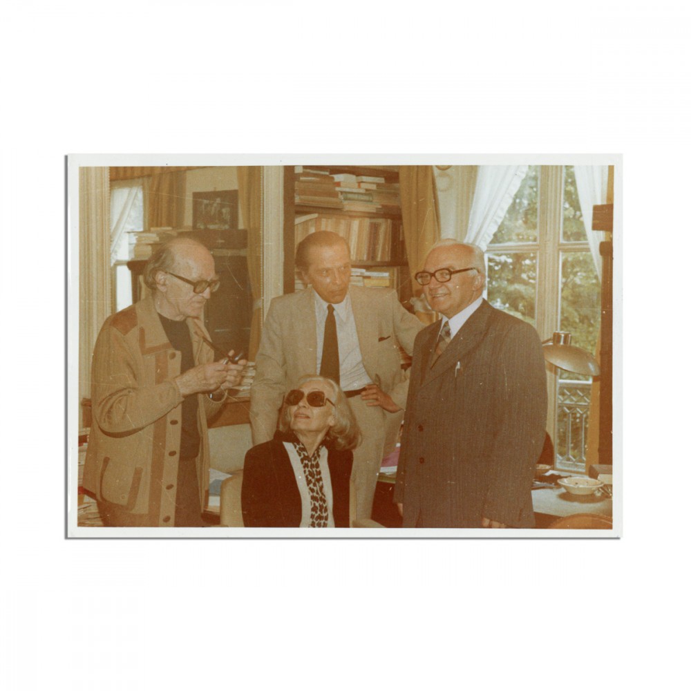 Fotografie de epocă în care sunt surprinși Mircea și Christinel Eliade în compania a doi prieteni, unul dintre aceștia fiind lingvistul Gheorghe Bulgăr. Fotografia a fost realizată în jurul anului 1985, în locuința soților Eliade din Chicago.