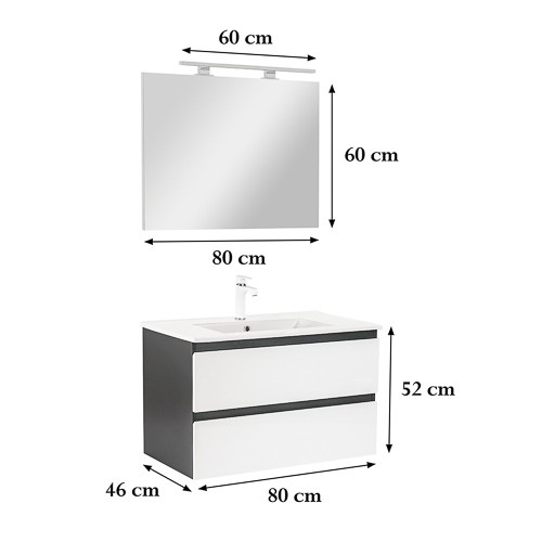 Mobilierul complet de baie Vario Forte 80 este o alegere elegantă și practică pentru o baie modernă. Dimensiunile sale compacte sunt ideale pentru băi mici și medii, iar designul alb-antracit conferă spațiului un aspect elegant. Sertarul cu închidere silențioasă și designul suspendat oferă confort și curățare ușoară, în timp ce materialele de calitate asigură o durată lungă de viață.