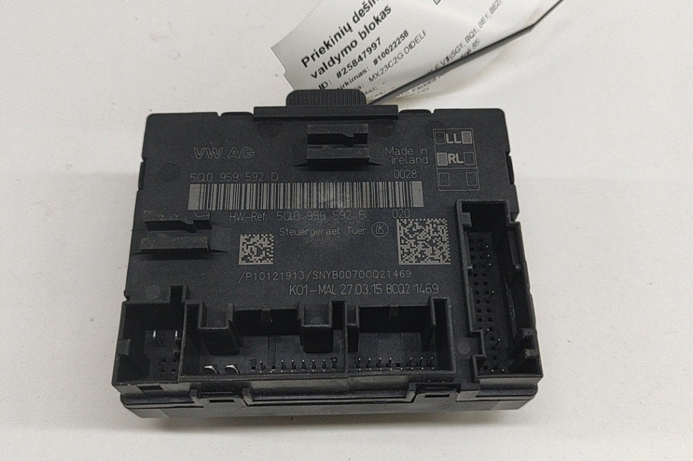 Modul de control ușă dreapta față VW GOLF VII 5G1, BQ1, BE1, BE2 . OEM: 5Q0959592D,5Q0959592B . Aceasta este o piesă originală de la producător, asigurând calitatea și compatibilitatea cu vehiculul dumneavoastră. . Expediem în siguranță din depozitele noastre din Europa Centrală și de Nord, folosind soluții logistice de încredere. Suntem cel mai mare depozit de piese auto din dezmembrări din Europa de Nord, oferind o gamă largă de piese second-hand precum motoare, baterii pentru vehicule electrice, cutii de viteze etc. Gama noastră include piese pentru BMW, Mercedes-Benz, Audi, VW, Seat, Toyota, Lexus, Tesla, Nissan, Peugeot, Citroen, Renault, Land Rover, Jaguar și alte mărci auto. Oferim garanție pentru piese originale și politică de retur. Când ne sunați, vă explicăm condițiile de garanție pentru fiecare caz în parte și organizăm livrarea folosind logistică modernă. Piesele uzate sunt acoperite de garanție.