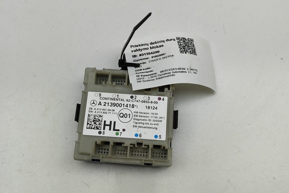 Modul de control ușă stânga spate MERCEDES-BENZ E W213 . OEM: A2139001418,A2139027111,A2139010908,A2C7470850800 . Aceasta este o piesă originală de la producător, asigurând calitatea și compatibilitatea cu vehiculul dumneavoastră. . Expediem în siguranță din depozitele noastre din Europa Centrală și de Nord, folosind soluții logistice de încredere. Suntem cel mai mare depozit de piese auto din dezmembrări din Europa de Nord, oferind o gamă largă de piese second-hand precum motoare, baterii pentru vehicule electrice, cutii de viteze etc. Gama noastră include piese pentru BMW, Mercedes-Benz, Audi, VW, Seat, Toyota, Lexus, Tesla, Nissan, Peugeot, Citroen, Renault, Land Rover, Jaguar și alte mărci auto. Oferim garanție pentru piese originale și politică de retur. Când ne sunați, vă explicăm condițiile de garanție pentru fiecare caz în parte și organizăm livrarea folosind logistică modernă. Piesele uzate sunt acoperite de garanție.