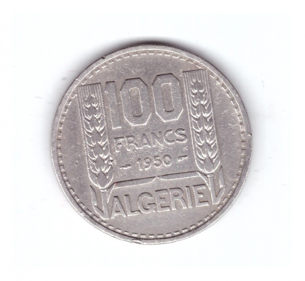 Moneda Algeria 100 francs/franci 1950, stare buna, curata, cu mici depuneri pe revers.