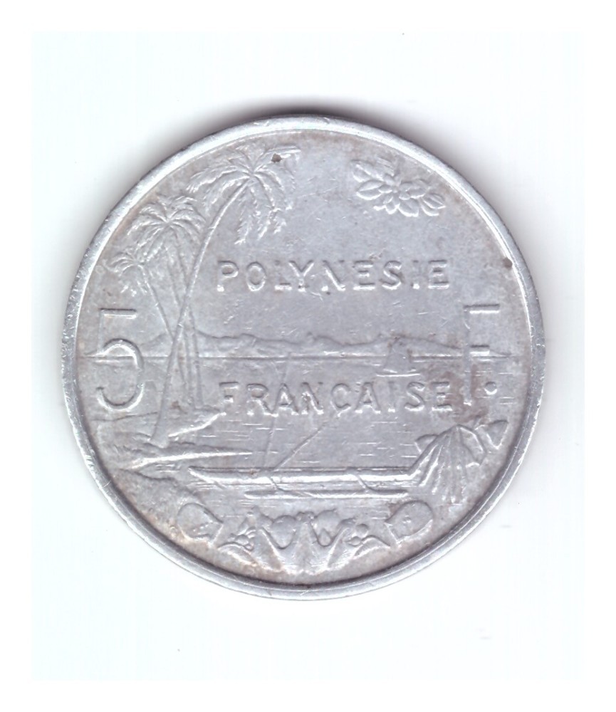 Moneda Polinezia Franceza 5 francs/franci 1975, stare buna, curata, are pe suprafata mici gaurele de la calitatea slaba a aluminiului.
