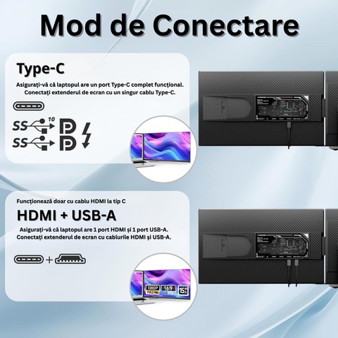 Monitor Extensibil Dublu Laptop 13.3-17", Ecran 15.6", IPS Full HD 1080P, 60Hz, Plug & Play, USB-C, Portabil, Compatibil Windows MacOS Android, Negru