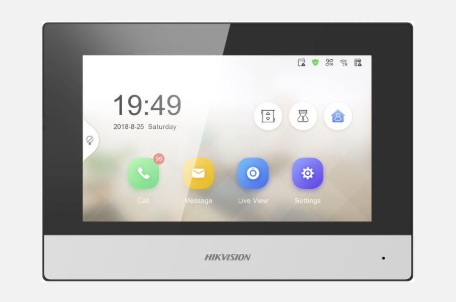 Monitor videointerfon WIFI 7inch color Hikvision DS-KH6320-WTE2; conectare pe 2 fire, ecran LCD 7 color cu touch screeen, rezolutie ecran 1024 x 600; design modern; conectivitate: Wi-Fi 802.11b/g/n; TCP/IP, SIP, RTSP; RS-485, comunicare audio video bidirectionala; memorare poze si mesaje pe card (nu este inclus), vizualizare live a posturilor de exterior sau a camerelor de supraveghere; Intrari alarma: 8ch; Iesire releu x 2 ; alimentare: conectare pe 2 fire din modulul DS-KAD706-S( nu este inclus), dimensiuni: 200mm x 140mm x15.1mm; greutate: 0.64kg