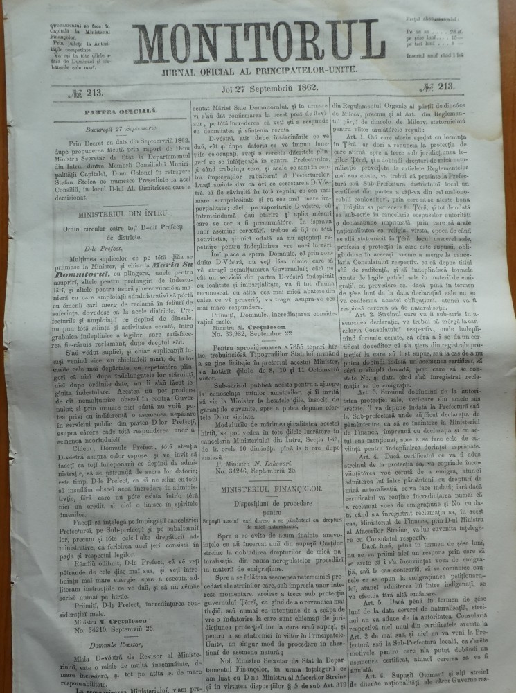 Monitorul , Jurnal oficial al Principatelor Unite , nr. 213 , 1862 , Bucuresti