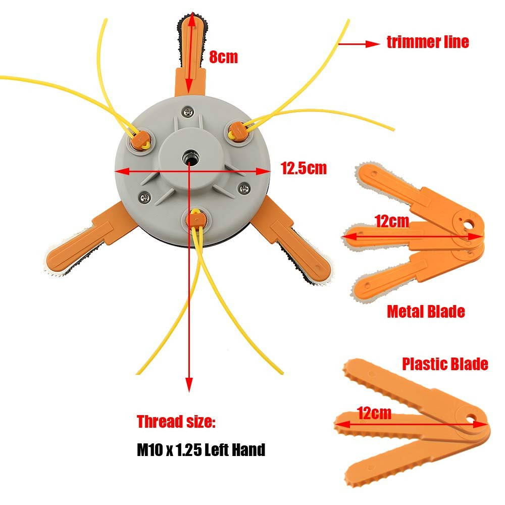Acest mosor (tambur) este prevazut atat cu 6 cutite (3 cutite de plastic si 3 de metal) cat si cu fir de nylon obisnuit.