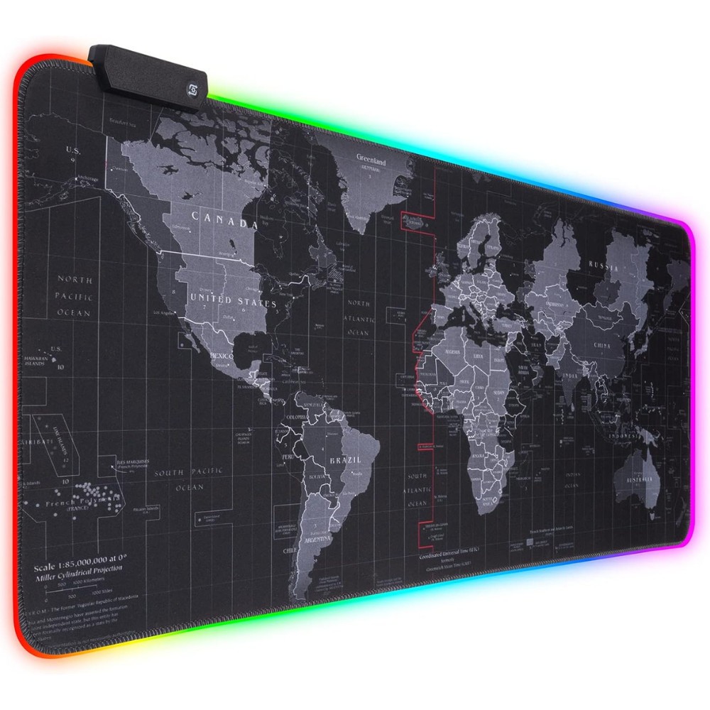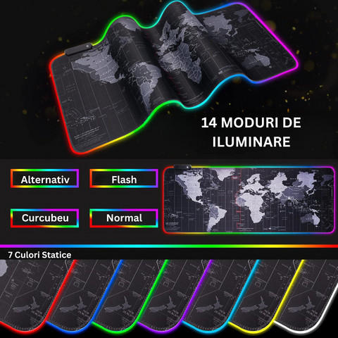 Mousepad Mare Cauciucat, Pentru Gaming, Birou, Office, cu Iluminare LED RGB, Antiderapant, Cusaturi Anti-Rupere, Waterproof, model Harta Lumii, Cablu