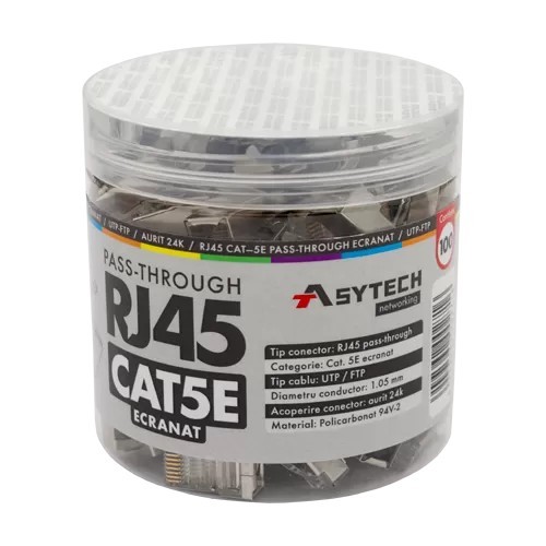 Conector RJ45 cat. 5e ecranat pentru cablu UTP ce permite o sertizare mai usoara si sigura datorita trecerii conductorilor prin mufa. Se poate face astfel o inspectie mult mai usoara a aranjarii corecte a conductorilor.