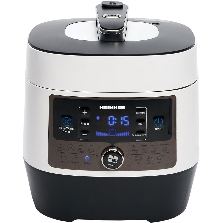 Multicooker cu gatire la presiune Heinner HPCK-6WH, 14 programe, vas antiadeziv detasabil, Timer, presiune reglabila, display LED, Alb