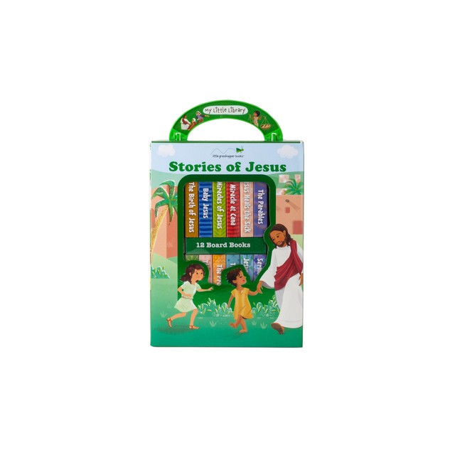 This Little Grasshopper Books collection includes 12 board books with art based on the life and teachings of Jesus.The simple stories will delight babies and toddlers.Whimsical illustrations bring the stories to life.The small sturdy board books are great for little fingers! - 3x3 inches each.The books included are: The Birth of Jesus, Baby Jesus, Miracles of Jesus, Miracle at Cana, Jesus Heals the Sick, The Parables, The Sower, The Good Samaritan, The Prodigal Son, The Lord's Prayer, The Sermon on the Mount, and Jesus and His Friends.The keepsake box houses all 12 books until it's time to bring them out again!12 board books - 10 pages each