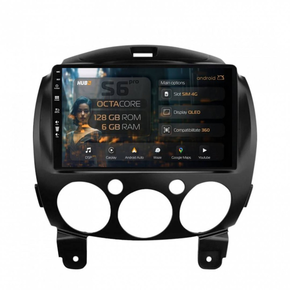 Navigatie Mazda 2 (2007-2014) 6GB RAM Android 13 Octacore Slot Sim 4G DSP GPS Wi-FI Carplay Android Auto USB Bluetooth Waze Touchscreen 9 Inch