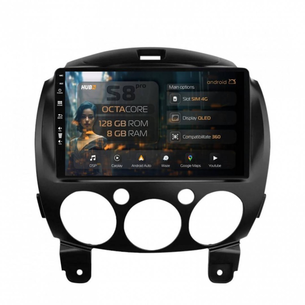 Navigatie Mazda 2 (2007-2014) 8GB RAM Android 13 Octacore Slot Sim 4G DSP GPS Wi-FI Carplay Android Auto USB Bluetooth Waze Touchscreen 9 Inch