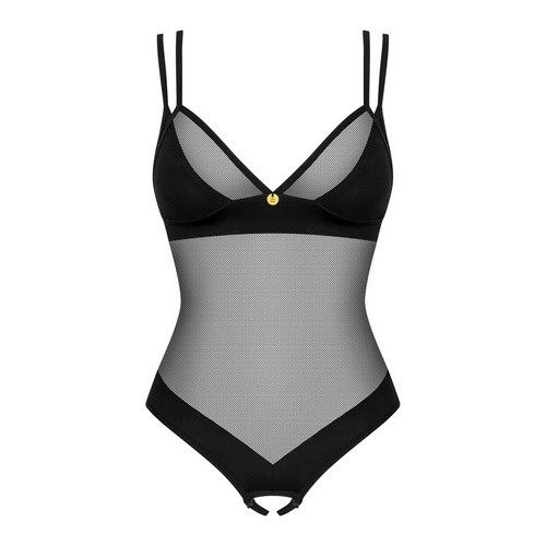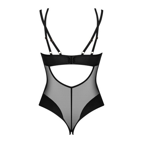 Body negru Nesari de la Obsessive. Plasă fină, elastică, cu detalii opace. Material moale și flexibil pe toată suprafața pentru un confort maxim. Sutien cu un element decorativ între cupe și închidere reglabilă cu cârlig în decupajul de pe spate. Bretelele duble, încrucișate inteligent, pot fi ajustate pentru o potrivire perfectă. Zona inghinală, cu două bretele subțiri, rămâne seducător de expusă.