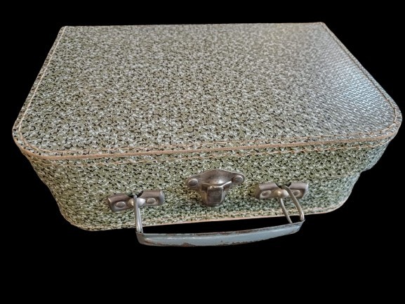 Realizată din carton, cu închizătoare, mâner, balamale și colțare din metal. Mânerul este pliabil. Închizătoarea funcționează normal.