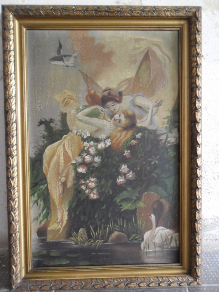 Nimfe - scena romantica, tablou vechi , pictura pe panza