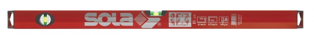 Nivela BIG X SOLA. Avantaje: Nivela cu profil din aluminiu, 630g/m; Toleranta maxima de 0,5 mm/m (0,029 grade); Capete pentru amortizarea socurilor; Bule rezistente la caldura; Design ergonomic; Bula orizontala este prevazuta cu lentile.