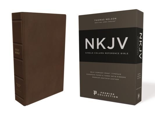 A beautifully crafted New King James Bible in a clear single-column format for an exceptional Bible reading experience.The Premier Collection of Thomas Nelson's NKJV Single-Column Reference Bible combines fine craftsmanship with the elegant single-column text. Enjoy the accurate and beautiful New King James Version typeset in Thomas Nelson's smooth and readable NKJV Comfort Print(R). Featuring a supple goatskin leather cover, durable edge-lined binding, premium European Bible paper, beautiful art gilded edges, and three ribbon markers, this special edition is a treasure for a lifetime in God's Word.Single-column format limits distraction and provides a nice readable flow of the textExtensive cross references allow you to find related passages quickly and easilyBlack letter text throughoutLine matched text for optimal clarity on the pagePremium European Bible paper, 36 gsm for limited bleedReading plans guiding you through the entire Bible in a yearConcordance for looking up a word's occurrences throughout the BibleThree satin ribbon markers, each 3/8-inch wide for you to easily navigate and keep track of where you were readingArt gilding on page edges: red stain under goldGenerous yapp serves to protect the high-end gildingGilt line stamped and perimeter stitchingSmyth-sewn and edge-lined construction to lay open with easeEasy-to-read 10.5-point NKJV Comfort Print